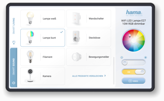 With the Point of Sale app, Hama’s smart products can be operated and tested live in the store via Android tablets. Product videos and information are also available. The POS app is adapted and configured by Hama individually and with minimal effort to the situation in the store and the available Hama products. Access to other functions of the tablet is blocked by the app and only possible for Hama headquarters.