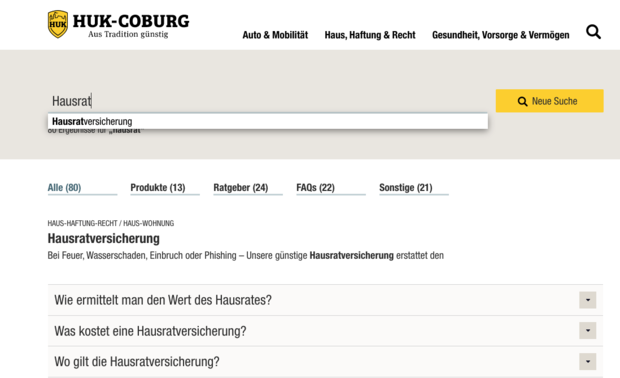 As a result, not only the speed and quality of the search results have been improved, but also their presentation: certain content can now be displayed directly in the search results and targeted by HUK itself, for example seasonally or on certain occasions.