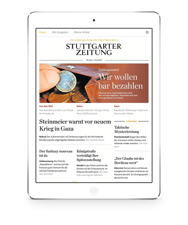 The “Stuttgarter Zeitung” is a regional newspaper for Stuttgart and Baden Württemberg with supra-regional appeal. It reports daily on politics, business, culture and sports as well as news from Stuttgart and the surrounding areas. The publishing house Stuttgarter Zeitung Verlagsgesellschaft mbH & Co. KG is 100% owned by Mediengruppe Süd, which in turn is proportionately owned by Südwestdeutsche Medien Holding (SWMH), one of the three largest daily newspaper groups in Germany.