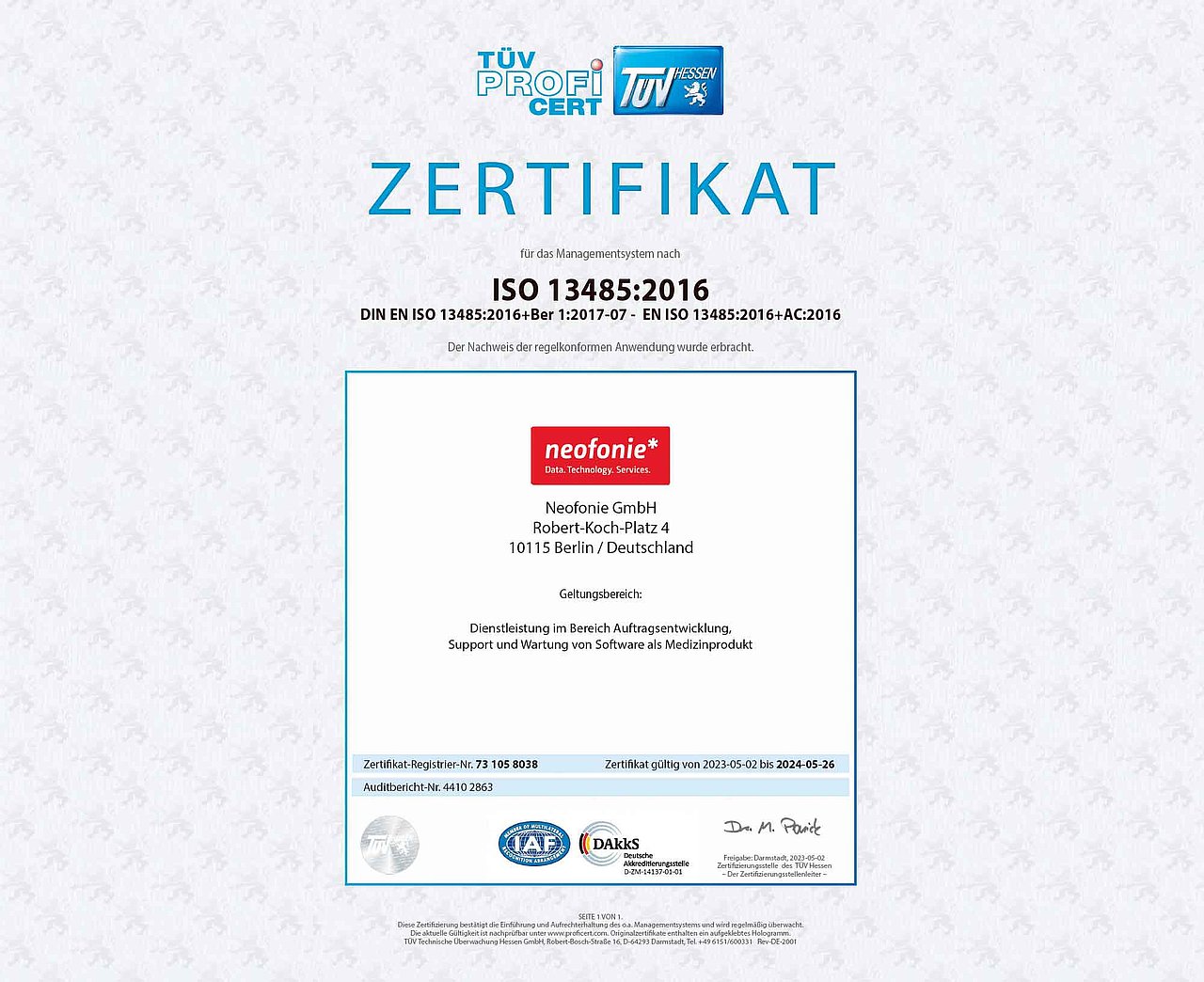 Neofonie hat nach erfolgreichem Audit für ihr Qualitätsmanagementsystem vom TÜV Hessen die ISO 13485 Zertifizierung erhalten. Damit erfüllt Neofonie die Anforderungen der Medical Device Regulation (MDR) in Europa und ist berechtigt, Medical Apps und Software als Medizinprodukt normkonform zu konzeptionieren und umzusetzen.
