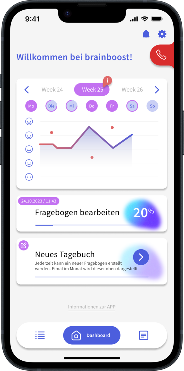 Zusammen mit Neuro-Technologie-Experten von brainboost ist eine digitale Companion Health-App in Form eines MVPs unter Einhaltung der Medizinprodukteverordnung Regularien (MDR) entstanden. Die App enthält sowohl einen Screening-Prozess zur Unterstützung der Diagnose von depressiven Störungen auf der Grundlage der Kriterien des ICD-10 als auch ein therapiebegleitendes Tagebuch zur Dokumentation der Symptome.
