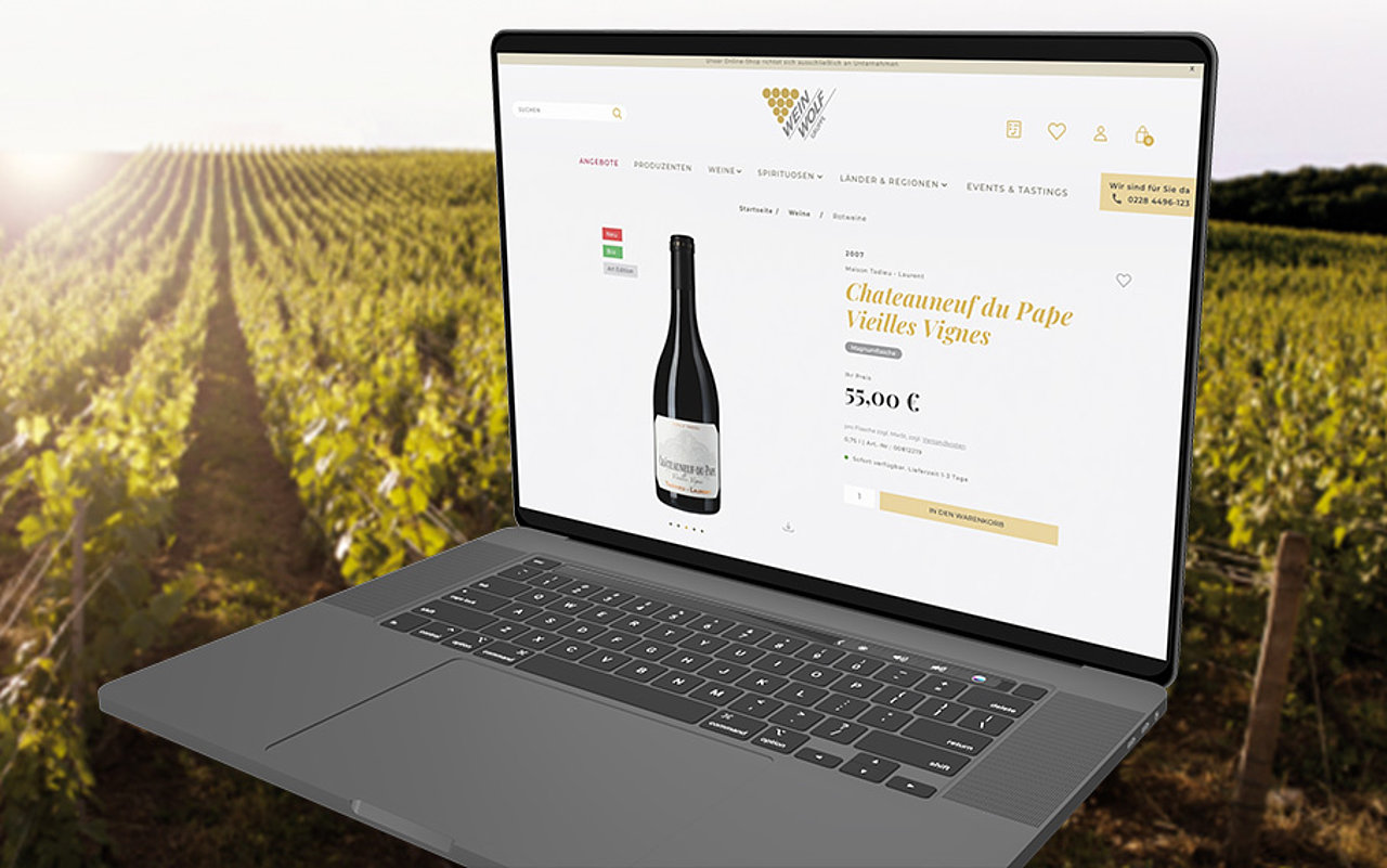 Für den Onlineshop wurde ein Standard-Shopware-Theme komplett neu konzipiert und umfangreich erweitert, um auf die Brand- und Marketing-Anforderungen von Wein Wolf einzugehen. So entstand eine Bühne für Marken- und Produktbotschaften des Unternehmens. Im Backend liefert der Self-Service-Bereich einen schnellen Überblick zur Bestellhistorie, Angeboten und Wunschlisten. Alle logistischen und für die Abrechnung relevanten Systeme sind dazu über Schnittstellen eingebunden, um den Kunden in Echtzeit mit Informationen zu aktuellen Produktinformationen und Bestellstatus bedienen zu können.